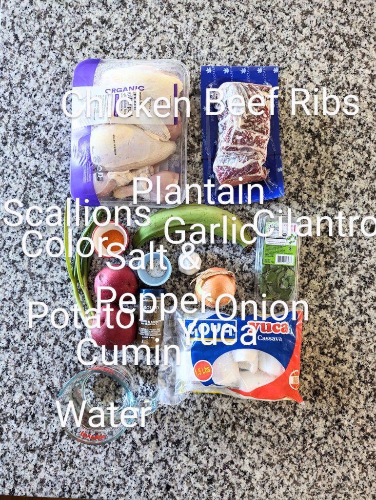 Vegetables: Onions, garlic, scallions, green plantain, potatoes and yuca. You can also add corn if you like.