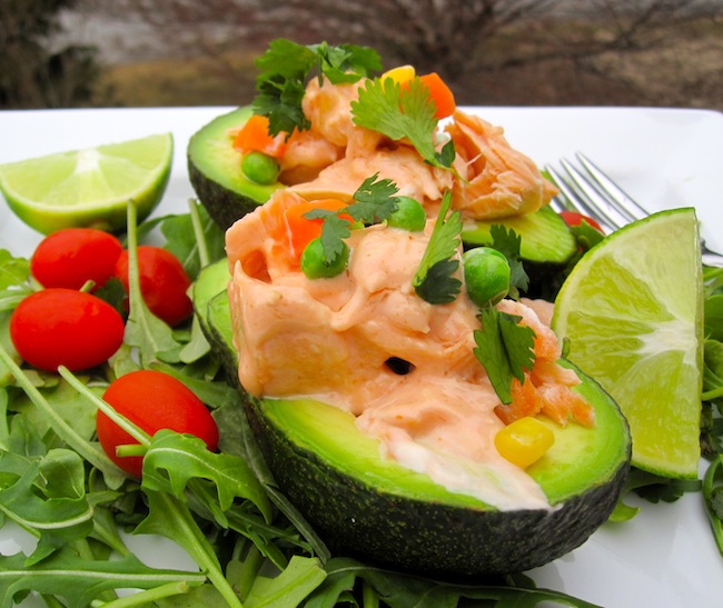 - Fill the avocados with the salmon mixture, add some peas, carrots and corn. Sprinkle with chopped fresh cilantro and serve immediately.
