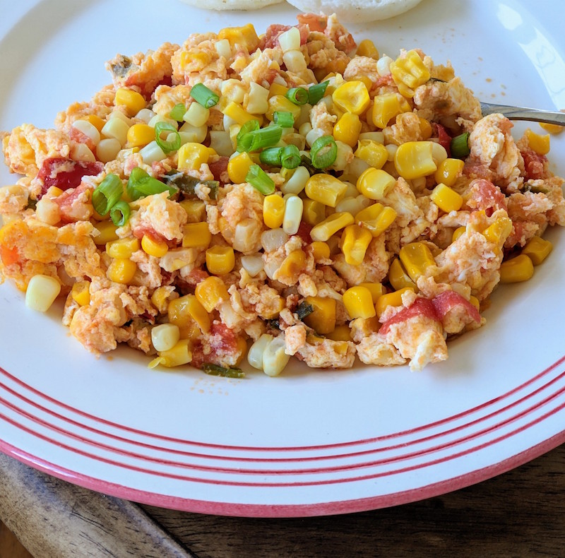 These scrambled eggs with corn, scallions and tomatoes are a wonderful variation of the popular Huevos Pericos, a traditional and very popular Colombian and Venezuelan breakfast recipe.