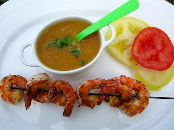 During the summer I want meals to be quick and easy to prepare, but also refreshing and filling. These grilled shrimp skewers are seasoned with cumin, paprika and onion powder to give them a nice flavor. Then they're grilled and topped with a sauce made with mango pulp, onion, hot pepper, garlic, cilantro and butter.