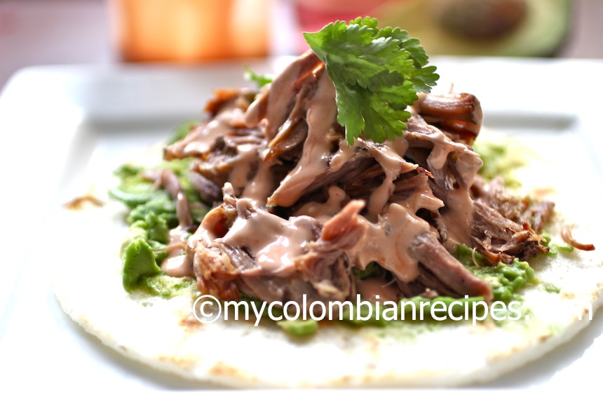 For this pulled pork recipe, I used a seasoning mixture commonly used in Colombian cooking on meats, consisting of ground cumin, ground achiote, scallions, garlic, onions and beer. The pork turned out tender with a wonderful flavor. This time I used the pork to make Pulled Pork Arepas with Avocado and Pink Sauce (Salsa Rosada). A simple and quick weeknight dinner, lunch or even breakfast, if you like.